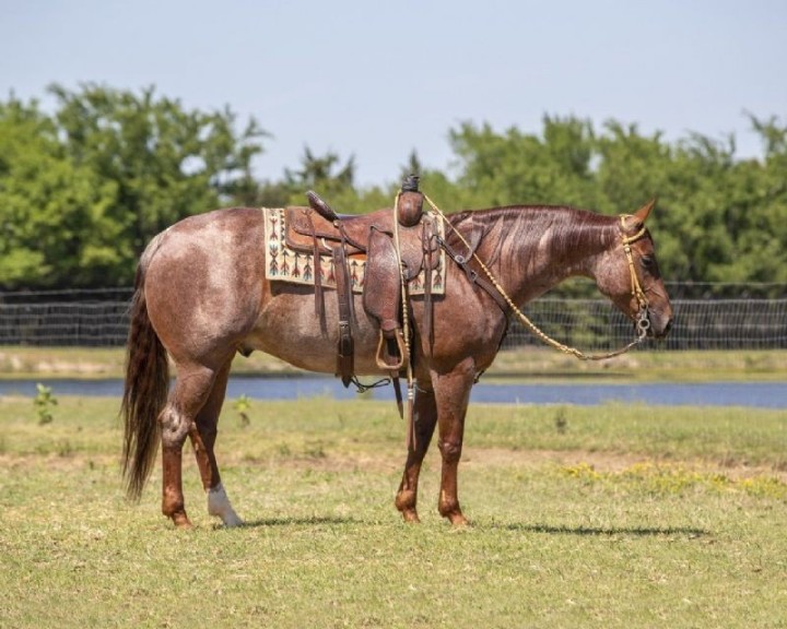 Go cut a cow, rope a steer, run a reining pattern, do all the ranch chores or pleasure ride, Bailey will be your number one go-to mount every time. No matter the job or task at hand, this gorgeous roan gelding will be your best partner! As cowboy looking as he is, he doesn’t require a cowboy to ride him. He’s honest and safe for any level of rider and always gentle to saddle and go even with substantial time off. Which makes him super handy in the sorting pens and fun to use on the ranch. You can rope a steer in the pasture, step off and he will hold strong from the horn and work the rope. He willingly side passes to open all the gates and stands quietly ground tied if needed. Bailey has fancy spins, long stops and easy lead changes. He would make an exceptional show horse in the Cowhorse events, Ranch Versatility competition and stockhorse shows. Nothing bothers this guy. He’s been exposed to crazy dogs, loud gunfire, blowing tarps, noisy traffic, heavy machinery, and everything else on our busy ranch. Bailey is great outside and enjoys leisurely cruising down the trails. He’s confident alone and will go right where you point him. His disposition is spot on and you will love his kind personality. Here is a top notch gelding that checks all the boxes.