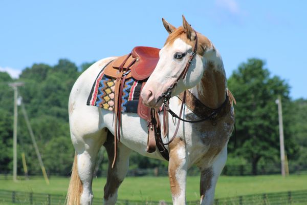 Florence All Time Beauty APHA mare! She stands 15 hands tall and is built like a tank! She is a beautiful Overo color with a Red Dun/Gold Palomino base. She is super sweet and gentle! She has been through our program and excels at all levels! She will lope around the very best and knows her leads well! She has a great head set and will sit down and stop! Florence has been ridden a lot outsides and loves the trails and easy rides around the farm! She also does well in the arena with obstacles and will come to the mounting block for mounting! Florence has beautiful markings and will get you noticed anywhere! She has been ridden by small children as well as adults! She is very laid back and easy to ride! She shoes well and loves to take a bath! She has done the very best with us and took care of our whole family! She has great coloring and is put together like one should be! She is a very safe horse to ride as well as be around! Not pushy or impatient! She is very gentle and loving! If you’re looking for a family horse don’t miss out on this one of a kind and very unique mare!