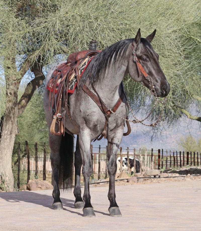 True BLUE roan and as handy as a leatherman! Legacy is a deluxe ranch horse, trail horse, rope horse, very trained and has a fancy handle! He’s been there and done that! As cowboy/cowgirl looking as they come and always safe and gentle! Legacy has been used for break away roping and heeling in the arena and has been used all over the ranch to doctor, gather, and sort cattle. He goes right where you point him without hesitation and is your number one partner! Nothing bothers this level headed, confident individual. He’s the kind that will entertain the entire family. Handy and fancy enough for the top ranch boss and kind and honest for the kiddos. Legacy has a good ground covering walk, smooth jog and comfortable slow lope on a loose rein. He has a great one handed neck rein and easily guides where you send him. He willingly crosses creeks and rivers, is very sure footed in the rocky mountainous terrain, and easily navigates through thick brush, deep mud, prickly cactus, and steep trenches. He’s accustomed to busy traffic, bicycles, motorcycles, and city lights. Wild dogs, blowing tarps, loud gunfire and heavy machinery don’t rattle his cage either. Legacy is a sweet boy that wants to please and get along. He doesn’t want to be wrong. This gorgeous gelding rides very nice, has excellent ground manners and is ready to do whatever you ask of him whether it be leisurely cruising down the trail or being the top ranch horse, Legacy will be your go to guy.