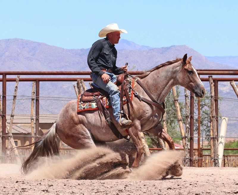 Holy smokes! Look what we have to offer! Lollipop is a beautiful red roan with a stunning flaxen mane. Talk about broodmare potential in the future! She loves to go work cows and is smooth, consistent and stylish. She is fun and easy to go drop your hand and just hang on. You could hold a cow from the herd blindfolded. She could easily go back to the show pen in cutting, but is very versatile and could go any direction you desire. Lollipop is safe, safe, safe and gentle every time you saddle her. She can easily be ridden by beginner or youth riders. She doesn’t want to be wrong and has the heart the size of Texas. You can catch her anywhere, climb up on her and be 100% worry free of any silly business. Lollipop is naturally low headed and cruises around like a Mercedes, classy and dependable. She is very good leaded with smooth lead departures and lopes around on a draped rein. She neck reins easily with fancy spins and great direction anywhere you want to go. She has big deep stops yet smooth and easy to sit. Lollipop lays down on command with trust and confidence around blowing tarps, crazy dogs and loud gunfire. She will boldly cruise down busy highways with traffic and bicycles. She is good around heavy machinery, pigs, buffalo and even a camel. Lollipop is a straight arrow outside of the arena and nothing bothers her. She portrays confidence alone and doesn’t buddy up to other horses. She is accustomed to deep water, sloshy mud, running rivers, thick brush, prickly cactus, rocky terrain, and the wildlife that pops in and out. Lollipop has been roped on, sorted on, gathered pastures, and is handy for all aspects of ranch work. She is great turned out with other horses and will load, tie and happily ride next to all the ranch geldings without pinned ears or a marish attitude. Lollipop is a lady in the barn and a sweetheart to handle. She bonds to her people and is very trusting and eager to please. Ride her now and have one jam up broodmare in the future! Her possibilities are endless. Standing 15.1 hands and built like one is suppose to be. Few and far in between, she is the type of mare that you will be proud to own.