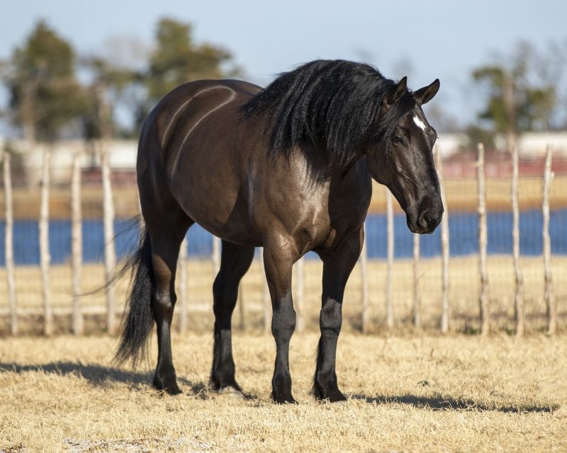 Rambo has made us understand the craze for “feather” footed horses. His gentle, kind demeanor is second to none. We love this big, gentle giant. He is 100% safe on the ground and on his back. He will pack any level of rider, young or old. Rambo is sired by a Quarter Horse/Percheron stallion and out of a Friesian mare. He is jet black and measures 16 hands. To start your day with Rambo simply whistle at the pasture gate and he comes like a big lovable puppy dog. Then signal him to lie down and climb aboard. Or stand on your mounting block and he will side pass over to you and stand quietly until asked to move forward.
