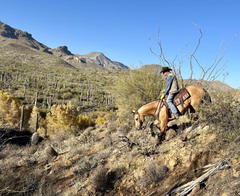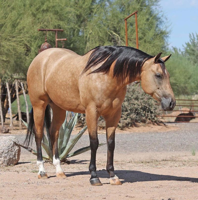 Quality through and through defines this handsome 8 year old gelding we affectionately call Randy! Standing 15.2 hands and stamped with America’s favorite color, buckskin, this striking gelding has so much to offer. Randy rides western, English, bareback or whatever strikes your fancy. He is safe, sane, and very calm in every aspect of his life. He has an ample amount of training in the arena and a great deal of exposure outside on the trails and throughout the ranch. Randy is always quiet, gentle and easy to handle on the ground and on his back. His ground manners are impeccable always being sweet and respectful. He is your model citizen gelding all the way around. He stands quiet as a church mouse to groom, bathe, tack up and mount up. He will side pass over to the mounting block, fence or lay down with a touch of the finger for you to climb aboard. Randy is beginner friendly, very tolerant, and unbothered by mistakes or miscues. He’s never anxious or worried about different places or new situations. Randy has a solid reining foundation and lopes soft collected circles and has a supple face and ribcage. He has nice spins, rollbacks, and side passes. He steers great with a one handed neck rein and stays right in-between the reins. Wherever you point him, he goes. Randy is a very graceful and elegant mover. He has the smoothest, most comfortable and easy to sit gaits. With an impressive big long trot, a slow jog that you can enjoy all day, and his lope is slow, steady and pleasant. Randy looks absolutely stunning under an English saddle and has western dressage written all over him. We have started him over smalls jumps and obstacles and he loves it. He never says no and will cross anything in his path. Randy spent the first few riding years of his life hitting the trails. He has seen every national forest and state park in our region. He is accustomed to mountains in the desert and high country, all types of water features, roaming wildlife, and overnight camping. He’s a soldier outside and will take care of his rider. He’s not spooky or watchy in anyway. He is very sure footed and knows where his feet are at all times. Randy is very useful all over the ranch. He’s good in the sorting pens and has gathered lots of cattle. We have tracked a lead steer in the arena and roped on him as well. He will follow right in behind a steer and track them nicely. He is accustomed to busy traffic, bicycles, motorcycles, loud gunfire, crazy dogs, blowing tarps, and heavy machinery. Randy is always a pleasure to ride in the arena, out on the trails, or anywhere on the ranch. It’s hard to find a horse with his size that has a modern day, blacktype pedigree.