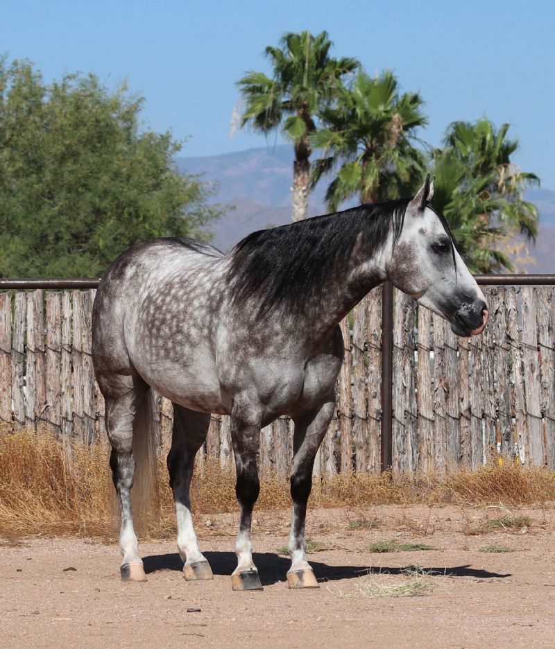 This little guy is seriously the cutest! Dapples for days stamped on this precious, sweet gelding! Standing 14.1 hands, Stones makes it pretty easy to mount or dismount. He loves all people and wants to please his person. He’s definitely a social butterfly. He will carry and take care of any level of rider. He is very safe and so gentle. Stones has the most comfortable little jog and the smoothest slow lope on a draped rein. He is naturally low headed and has the prettiest way of going around the arena. He’s fun to do the reining maneuvers on with great speed control, pretty spins, automatic lead changes, and a long sliding stop. He’s so easy and simple to ride. Stones is a very fluid and elegant mover and he would excel in the ranch riding and versatility events. Go show him, trail ride or maybe both, he’s an all around great time in any situation. Stones also pulls the cart, wagon, or anything you hook him to. He’s accustomed to a 12 ft wagon going down a busy road or cruising the cart around the desert. You can hook him up alone and he stands quietly and patiently. He is safe, confident, and looks absolutely stellar going down the road hooked up and is definitely a head turner. Stones is a blast to trail ride or leisurely cruise down the road. He’s not spooky and fearless alone. He happily goes right where you point him without hesitation. From day one in our program nothing has phrased him and he easily adapts to everything we throw his direction. Stones is always quiet to handle on the ground and has absolutely no silly business when you ride him. He doesn’t have a mean bone in his body and is a happy, willing, and honest partner. He doesn’t require consistent riding and can easily handle time off. Once a week, once a month, or 6 times a year, he rides the same. Stones is great with other horses and accustomed to crazy dogs, cattle, buffalo, pigs, and wildlife. We have penned roped cattle and he likes that too. He’s handy to use all over our ranch and will ground tie where you drop a rein, side pass to open and close gates, go over bridges, logs and drag anything you dally to the saddle horn. Stones is a total lover boy and enjoys grooming, bathes and and being social. He’s so easy to teach new things and is happy to learn. He never says no and don’t let his size fool you, he can do anything the big boys can. He’s conformationally very balanced and correct. He physically attracts attention to anyone that lays eyes on him and after you get to know him you fall in love. Young, older, or anywhere in between, beginner or advanced, Stones will be a soldier. He will go slow and take care of you, but still has all the talent and athleticism if you ask. So much fun wrapped up into this Fun-Sized package!