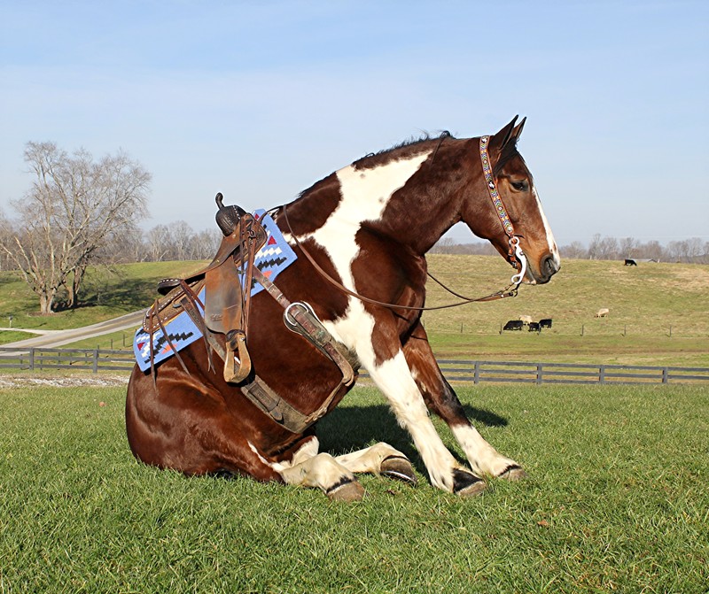 Tessy is a stocky built 1450lb mare standing around 16hh with some very nice markings. We bought Tessy from an Amish kid in Michigan who trained her with natural horsemanship methods. She is trained to lay down for mounting from the ground or she will lay down for you to dismount from the saddle, which is a great tool to have for anyone who has knee or hip issues or if you are handicapped. In addition to laying down she will bow and set like a dog and play kick the can. She has been taught all about leg pressure and will ride without a bridle. She will ride with a rein around her neck or just totally by using your feet. She will back, spin, turn, sidepass both ways, lope and slide stop all by using leg cues. She has been camping, we have used her around cows, trail ridden her hundreds of miles and hooked her up and drove her under a harness. We have ponied other horses off of her and used her to break colts to lead. She has been ridden around farm equipment, ATV’s, over large noisy tarps and has also had guns shot off of his back. No matter where she goes or what she does, Tessy is not spooky acting. She has been exposed to all kinds of wildlife such as deer or turkey or other animals like cows or dogs and will go anywhere that she is asked too. She has been rode many miles in the mountains of California and encountered every obstacle possible on the trail. She will go up or down even the steepest slopes, across deep creeks, over downed trees, and over all types of rough terrain while still being sure footed. She has been rode in traffic, and is very traffic safe around cars, semi, log, and dump trucks. She is one of the friendliest horses that you will find, in fact she will follow you around and even go for a job with you. She has a great attitude about whatever she is asked to do. One lucky person is about to get the love of their life with this gal!!!